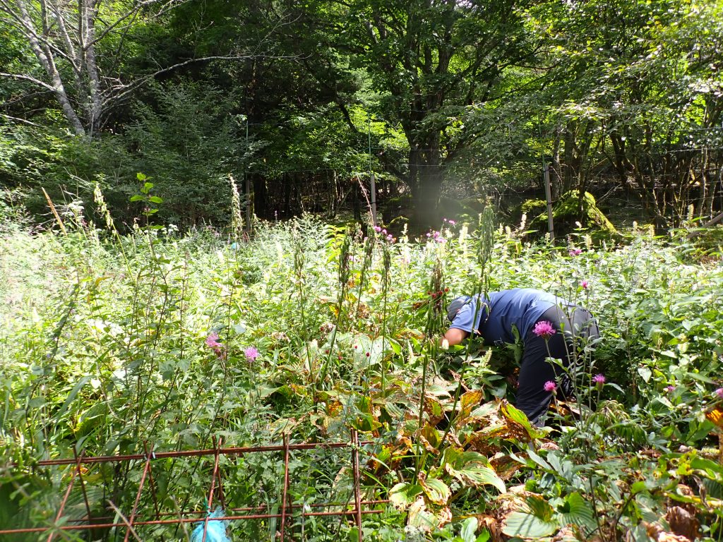 こ9月6日 三ツ峠ネットワークの例会活動を行いました。活動内容は木無山直下の防鹿柵内のササ刈りとテンニンソウの抜き取りを行いました。この日はいつも来て下さるメンバーの方々に加え、初参加となる地元の登山ガイドの春木さんの協力もありました。